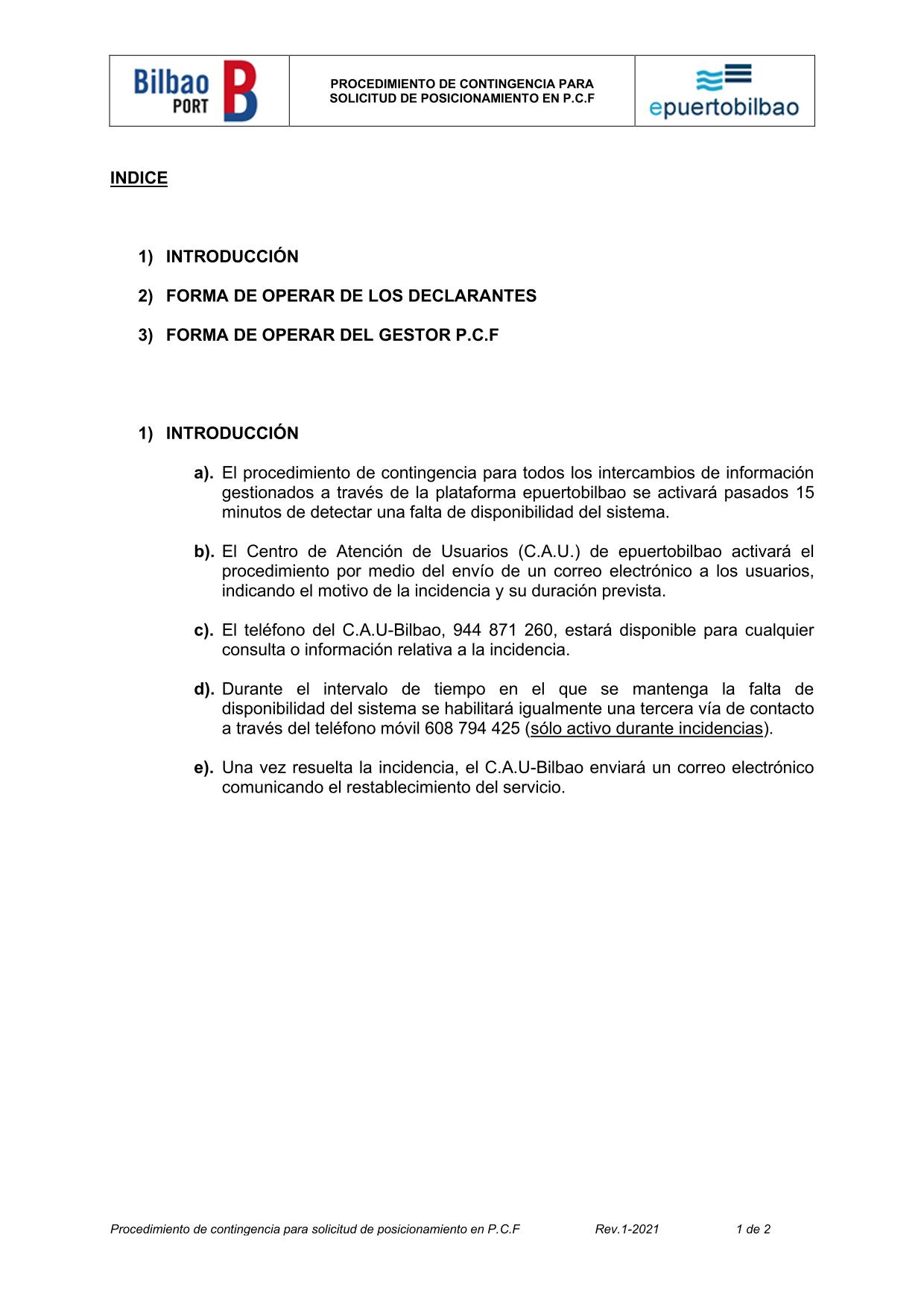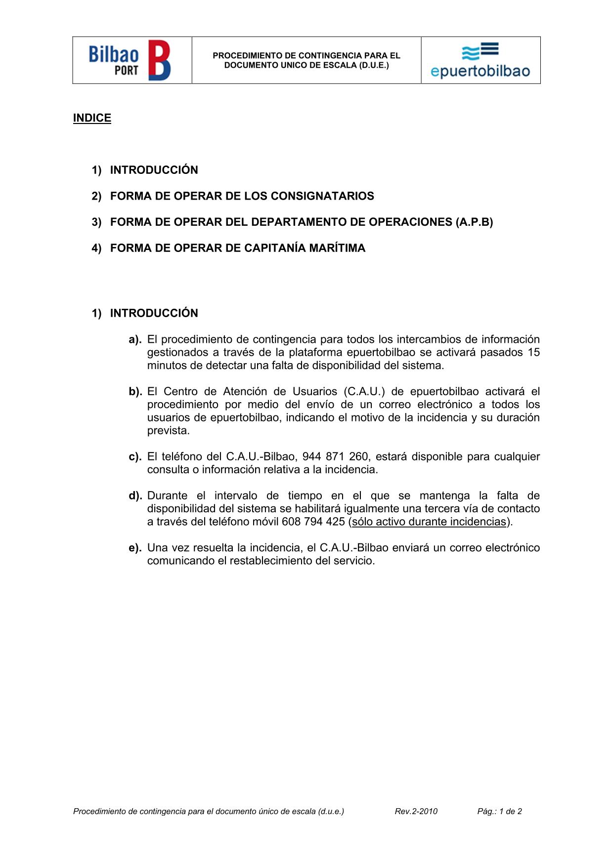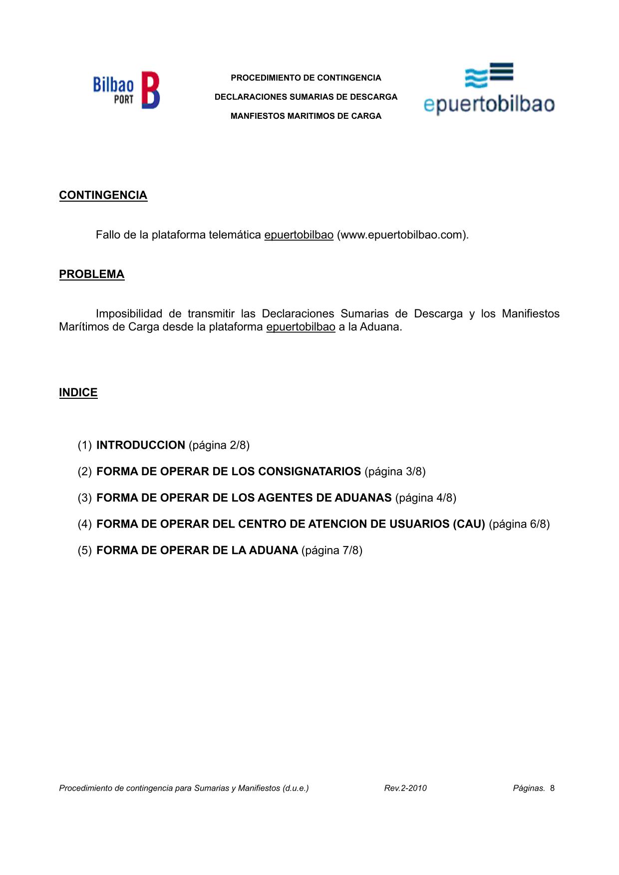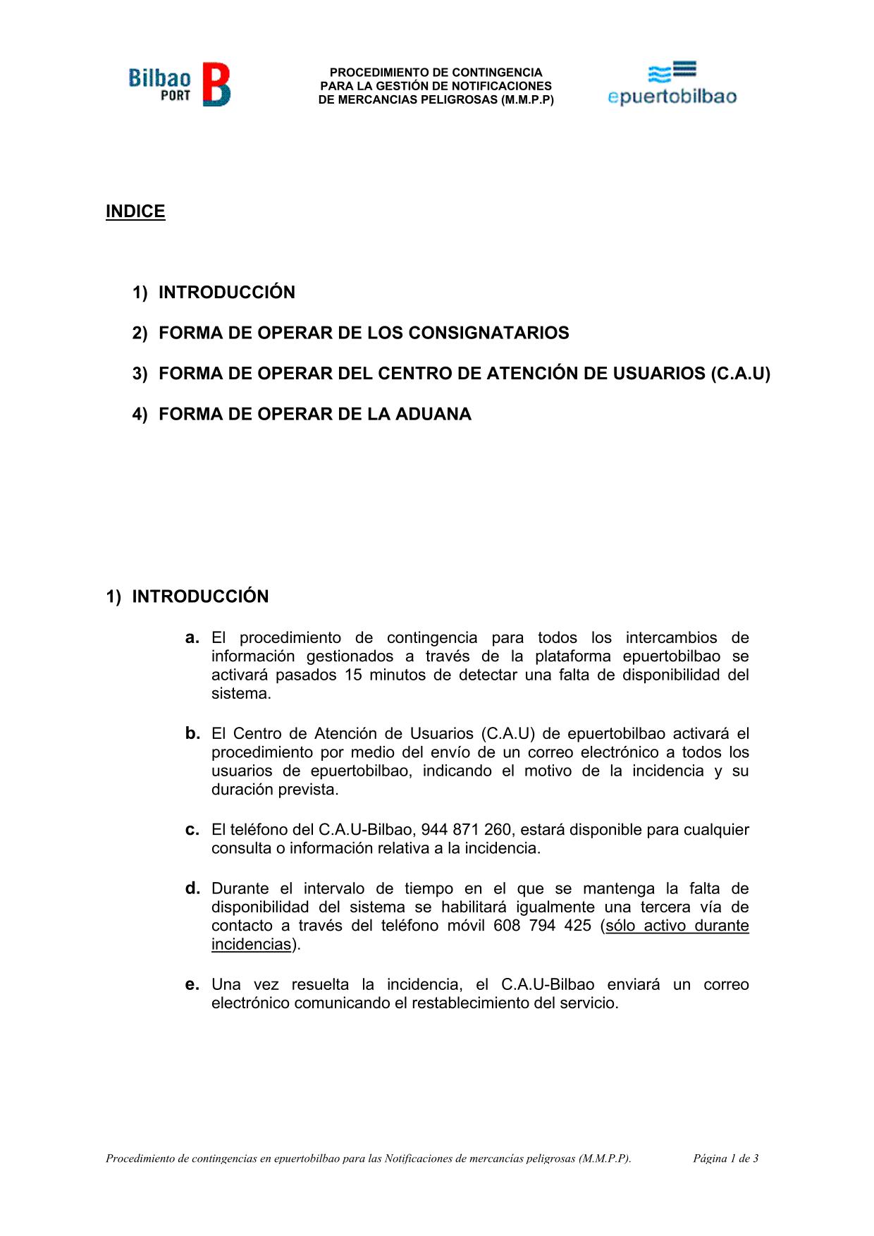 This document describes how will have to operate the Consignees, Customs Agents, the User Support Centre (CAU) and the Customs Bilbao in case of unavailability of e-puertobilbao telematic platform.